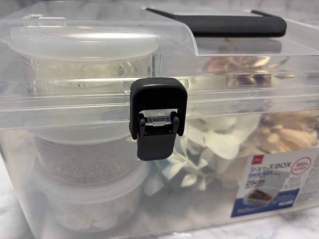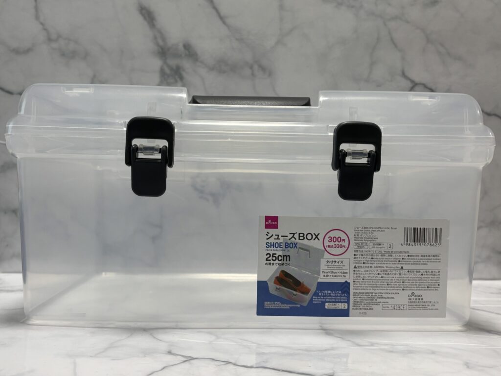 先日ダイソーでこちらのシューズBOX(25cm)を見つけて、ダイソーの造花を入れてみたところ、ちゃんと入ります!
