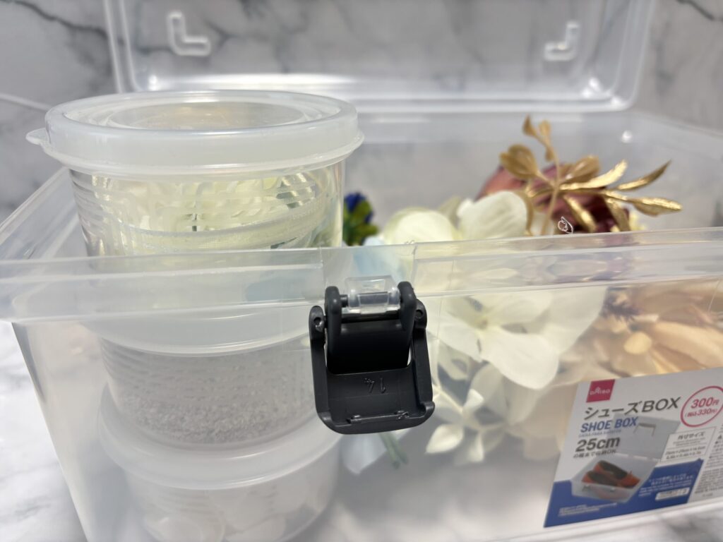 また、造花に加えて、細かいものをちっちゃいタッパーケースに入れて収納しております。