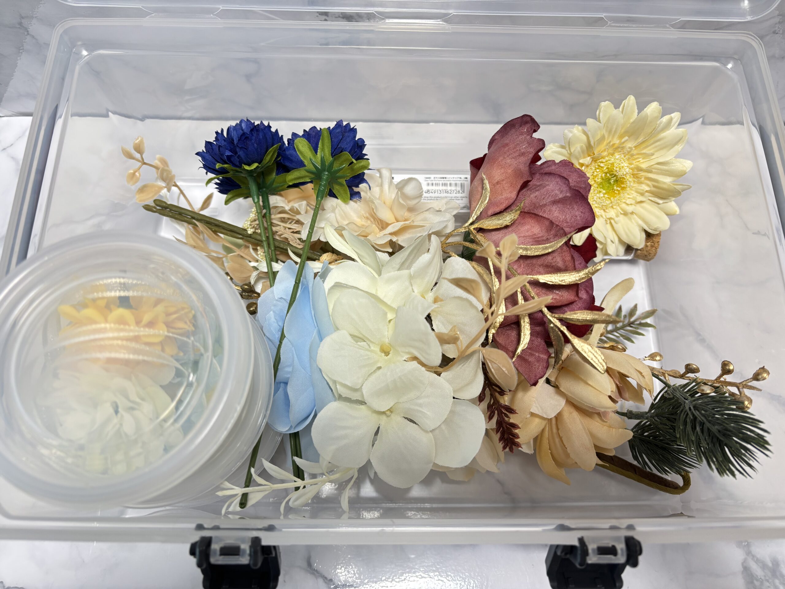 また、造花に加えて、細かいものをちっちゃいタッパーケースに入れて収納しております。
