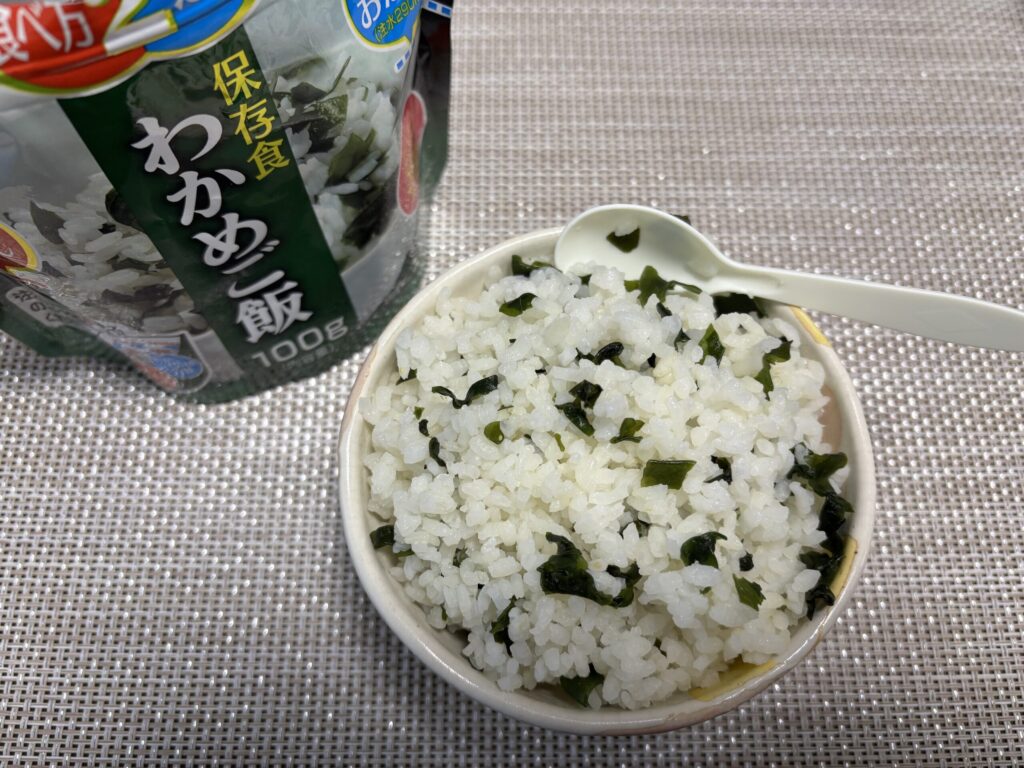 わかめごはん2食と、個包装のビスコ4つほどがパウチされたものが3袋ほどあったのですが、ビスコは早々に息子のおやつとして消費されていきました。おいしいもんね。